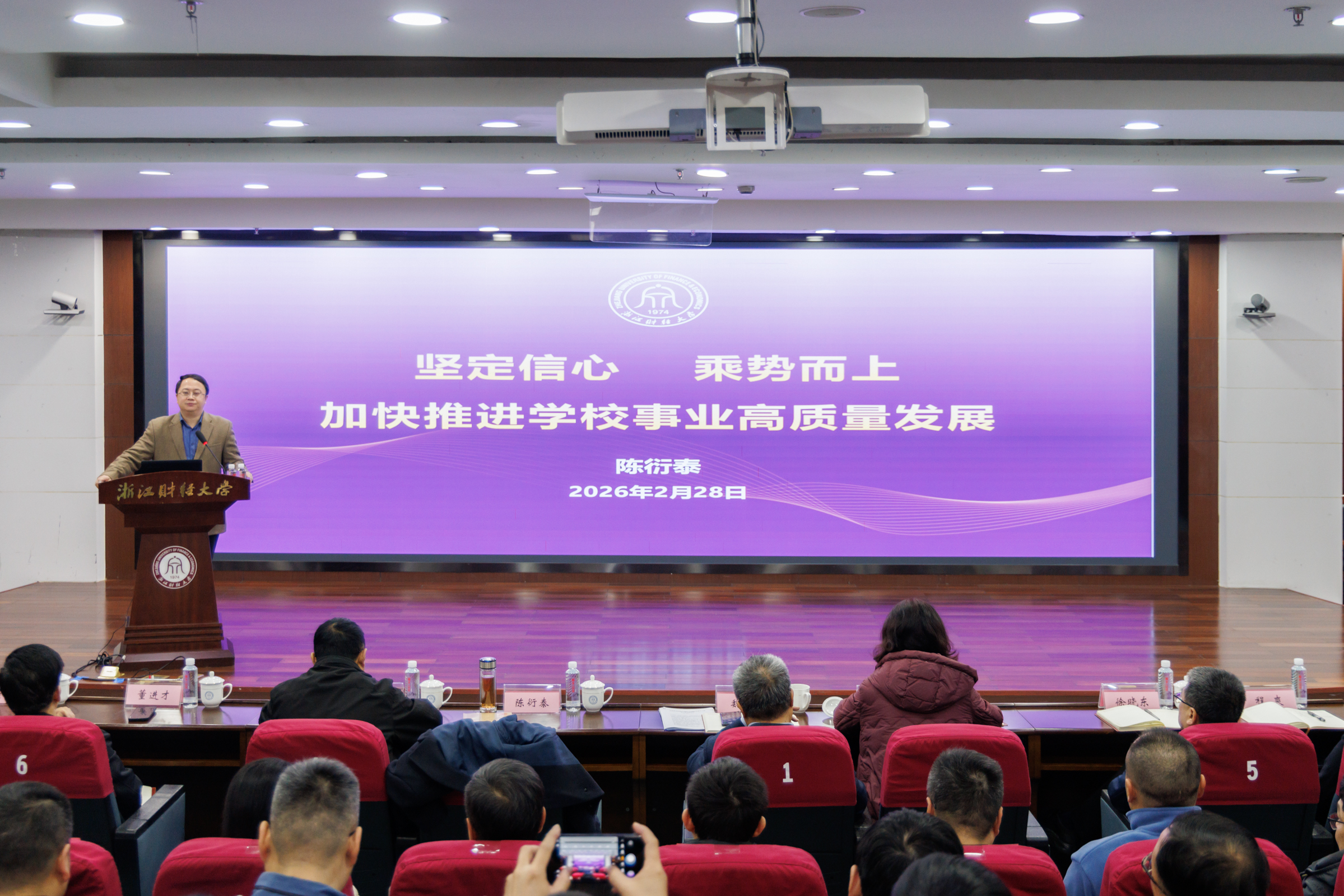 陈衍泰以《坚定信心 乘势而上 加快推进学校事业高质量发展》为题作工作部署。陈衍泰强调,2026年是“十五五”规划的开局之年,也是浙江高质量发展建设共同富裕示范区取得决定性进展的关键之年。面对国家战略、浙江部署、科技变革和区域需求的深刻变化,浙财大必须主动识变、应变、求变,要提站位、观全局、谋大势,打破路径依赖、推进系统重塑,坚定走好“新财经战略”之路,用心回答“强国建设,浙财何为”的时代命题。