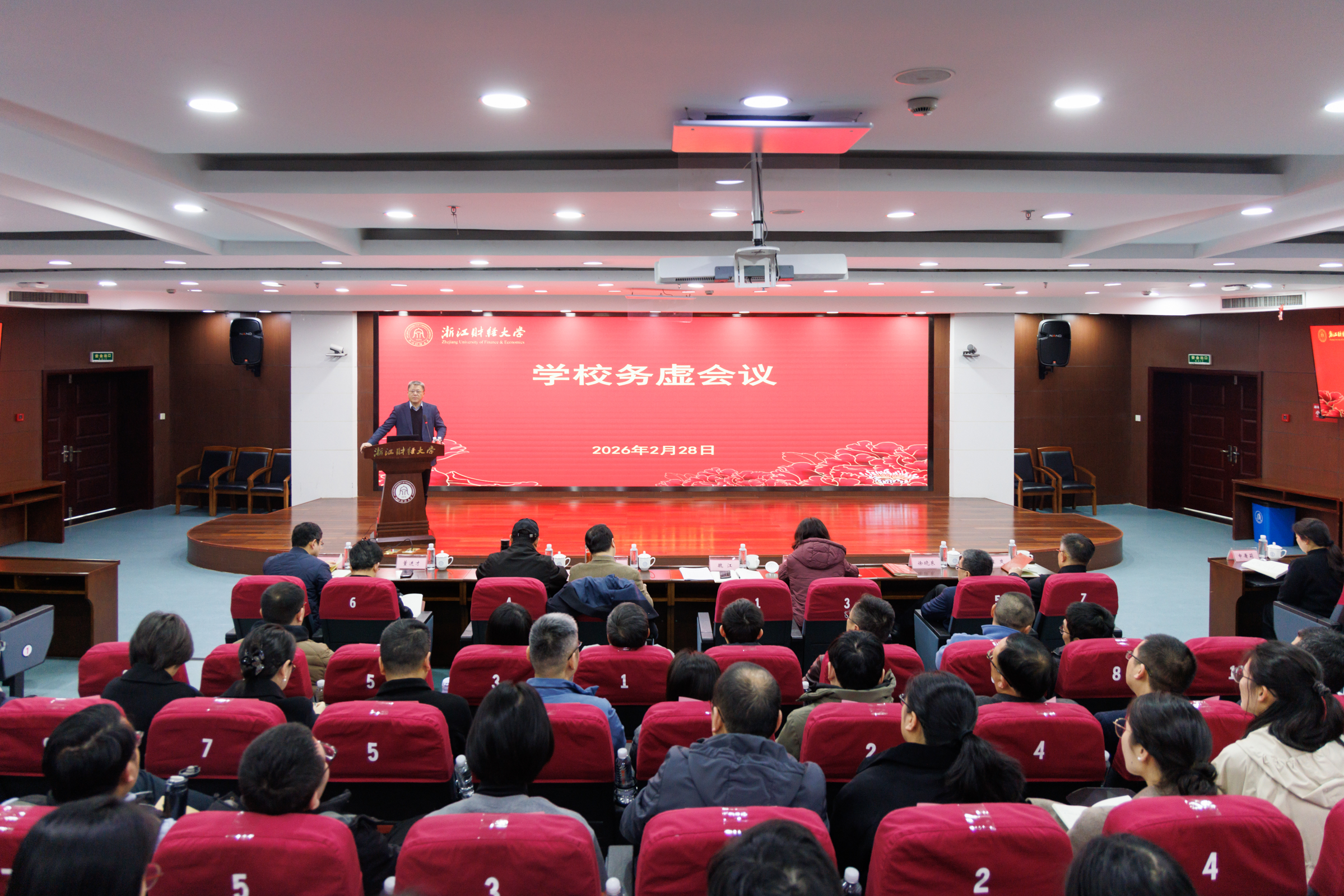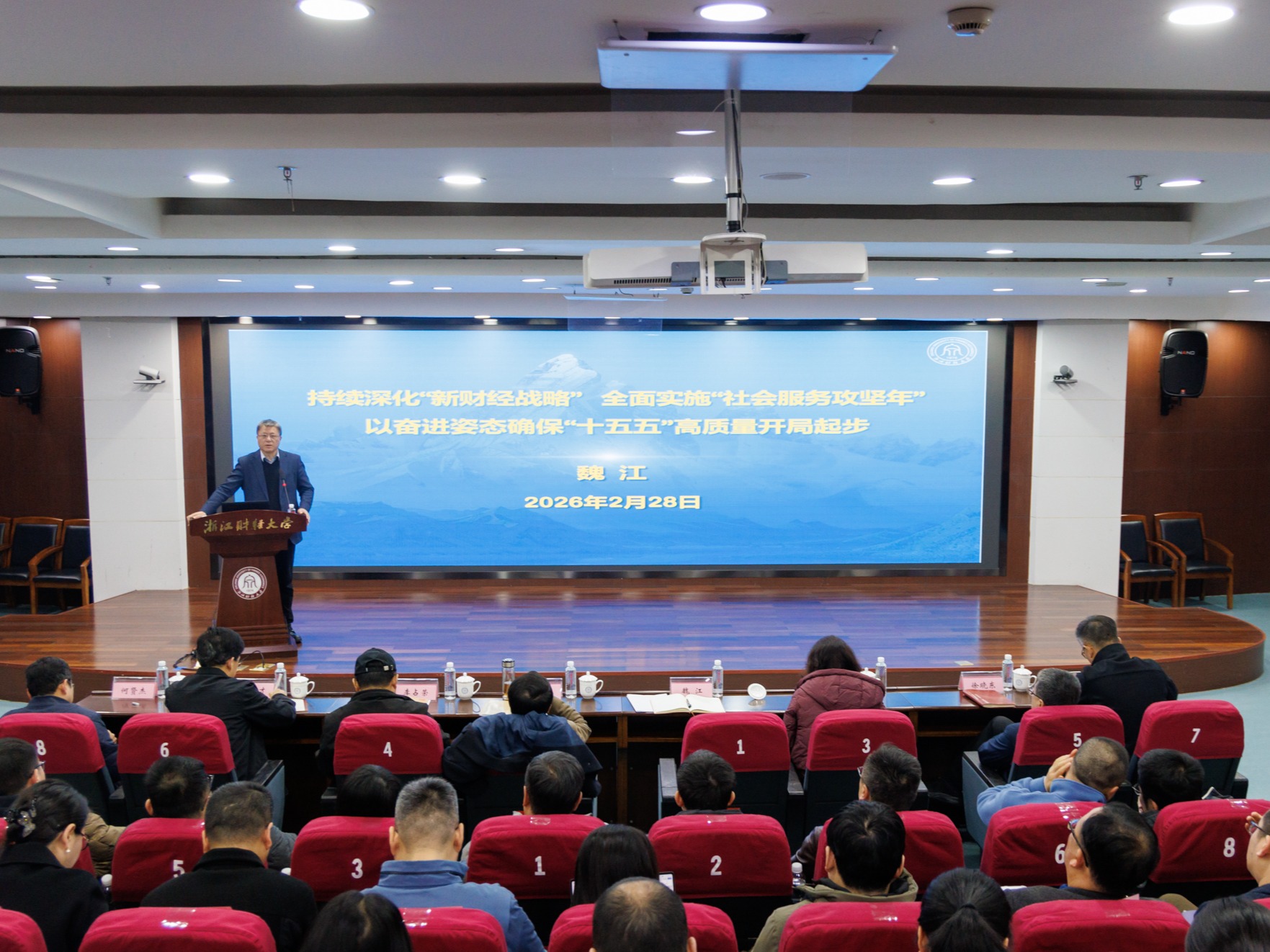 魏江作题为《持续深化“新财经战略”全面实施“社会服务攻坚年”以奋进姿态确保“十五五”高质量开局起步》的讲话。魏江强调,“务虚是为了更好地务实。当前,学校各项改革任务进入强力破题阶段,要屏住气、再坚持,突破挑战期,就会迎来新状态、新境界。”2026年是学校迈向“十五五”新征程的奠基之年,全校上下必须提高政治站位,强化使命担当,以“时不我待、只争朝夕”的紧迫感,全力以赴抓好各项工作。